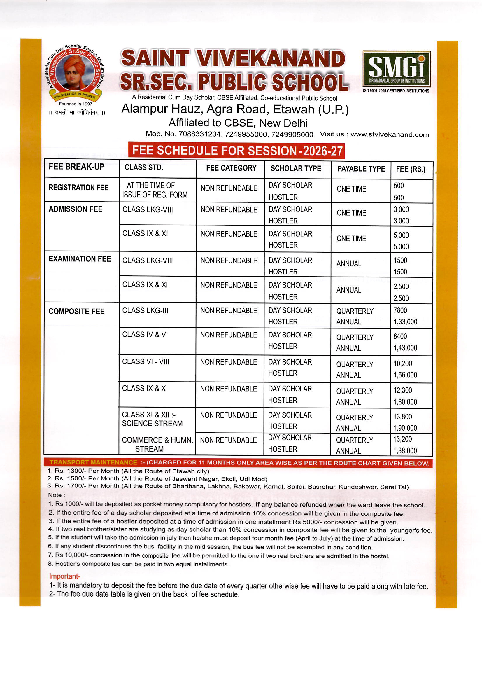 For any cheque not cleared up to due date for any reason, a penalty of Rs. 200/- plus Rs. 50/- per day will be charged for the delayed payment till 30th day of that month in which the fee is due. Thereafter the name of the student will be struck off the rolls and re-admission fee will be charged to continue study in the school. Re-admission will be granted subject to the availability of seat and payment of arrears along with re-admission fee.